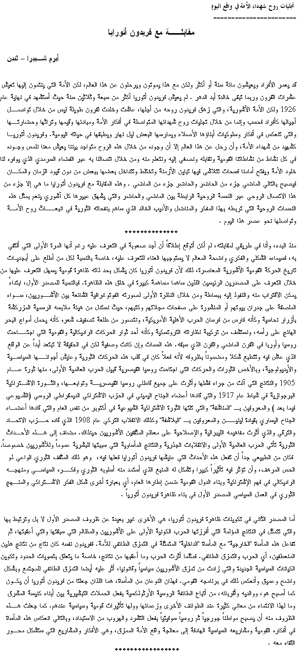 نحن الاشوريون بجميع طوائفنا ومذاهبنا دوما نعمل من أجل الحرية والسلام والرخاء. لكن حلمنا النهائي هو أن يكون لنا وطنا قوميا ونسميه ... آشـــور